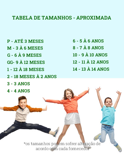 | Bebê | P | 3 meses | 62 cm | 44 cm | 41 cm | 44 cm |